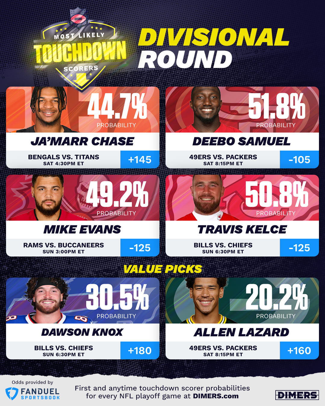 Using the very best data and predictive analytics models, Dimers.com crunches the numbers to find the NFL players most likely to score a touchdown in Divisional Round.